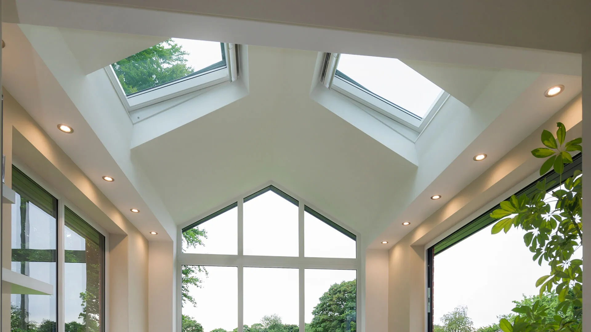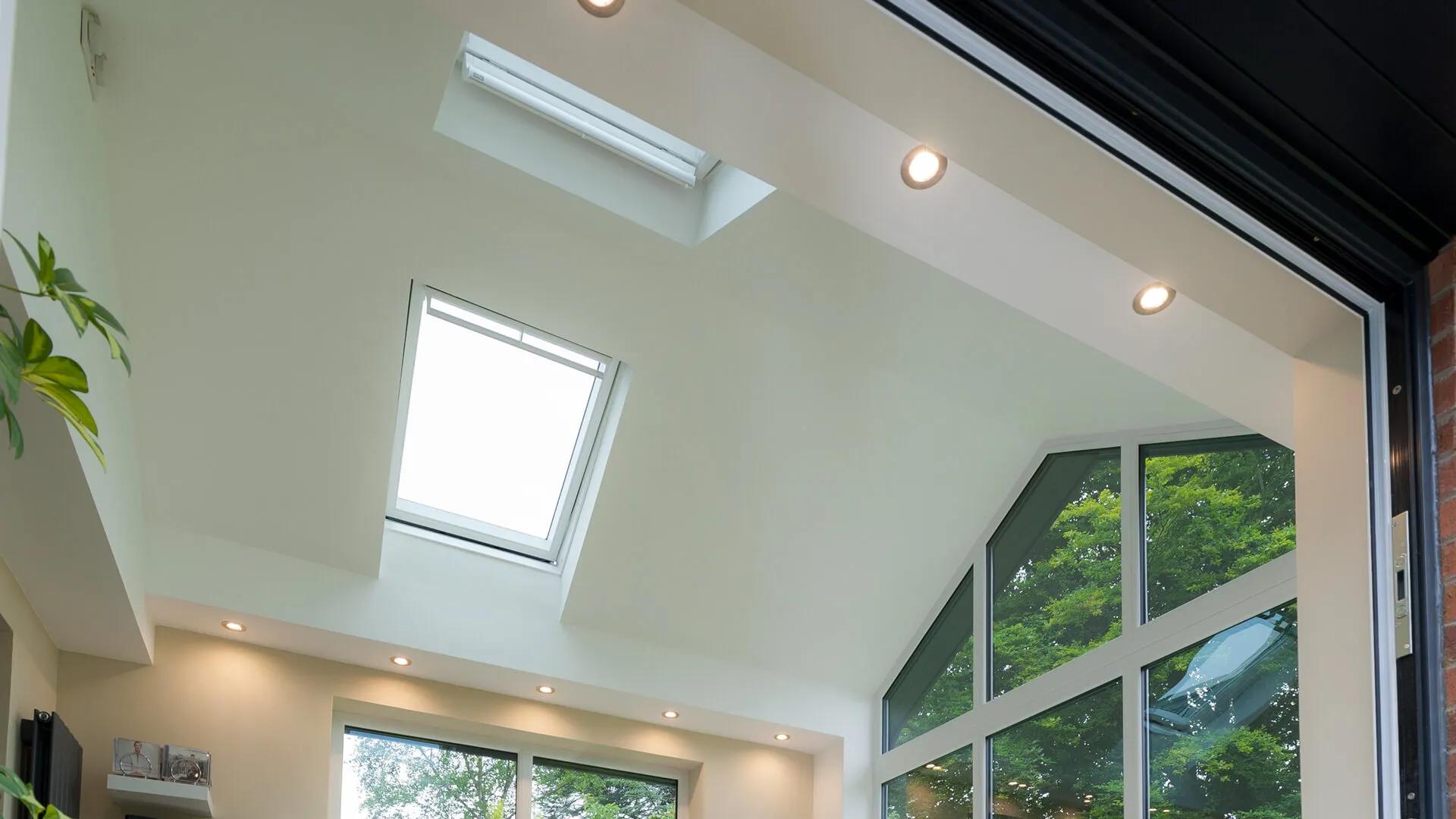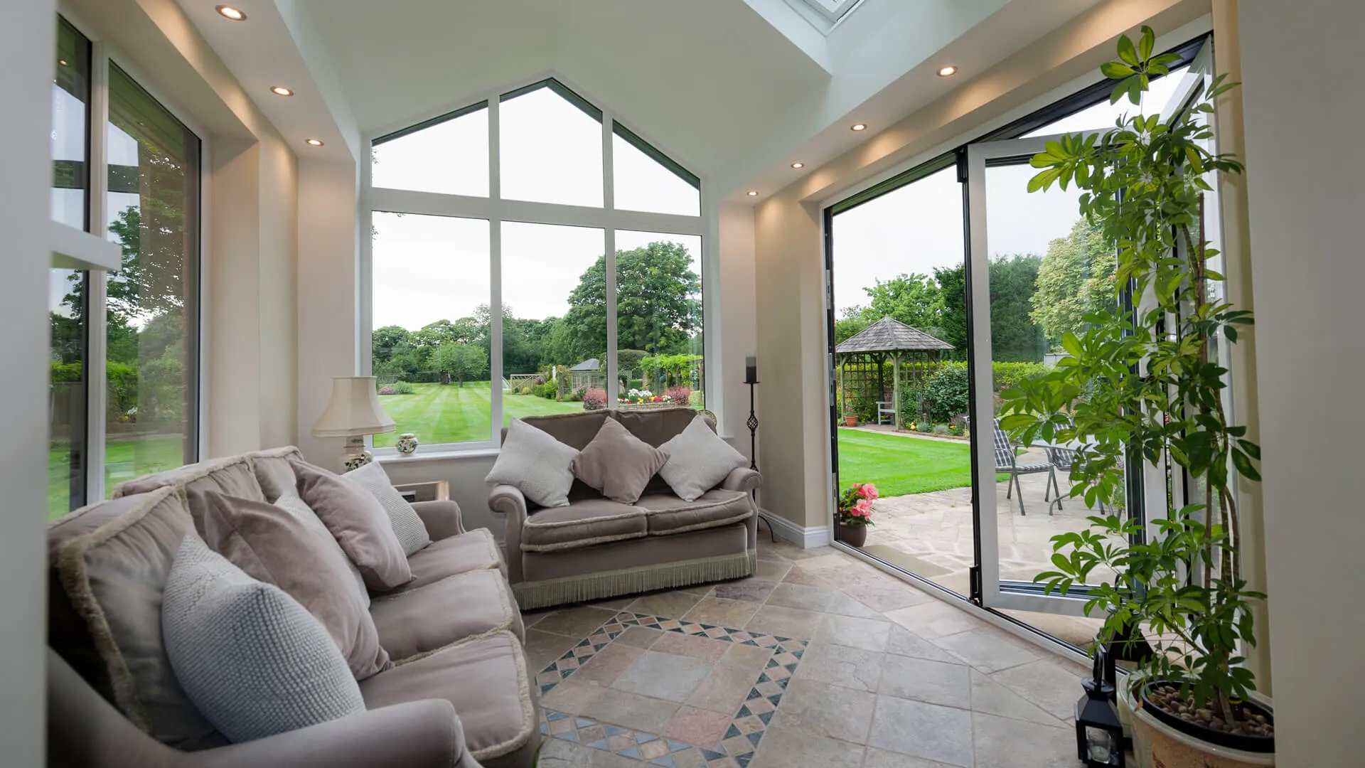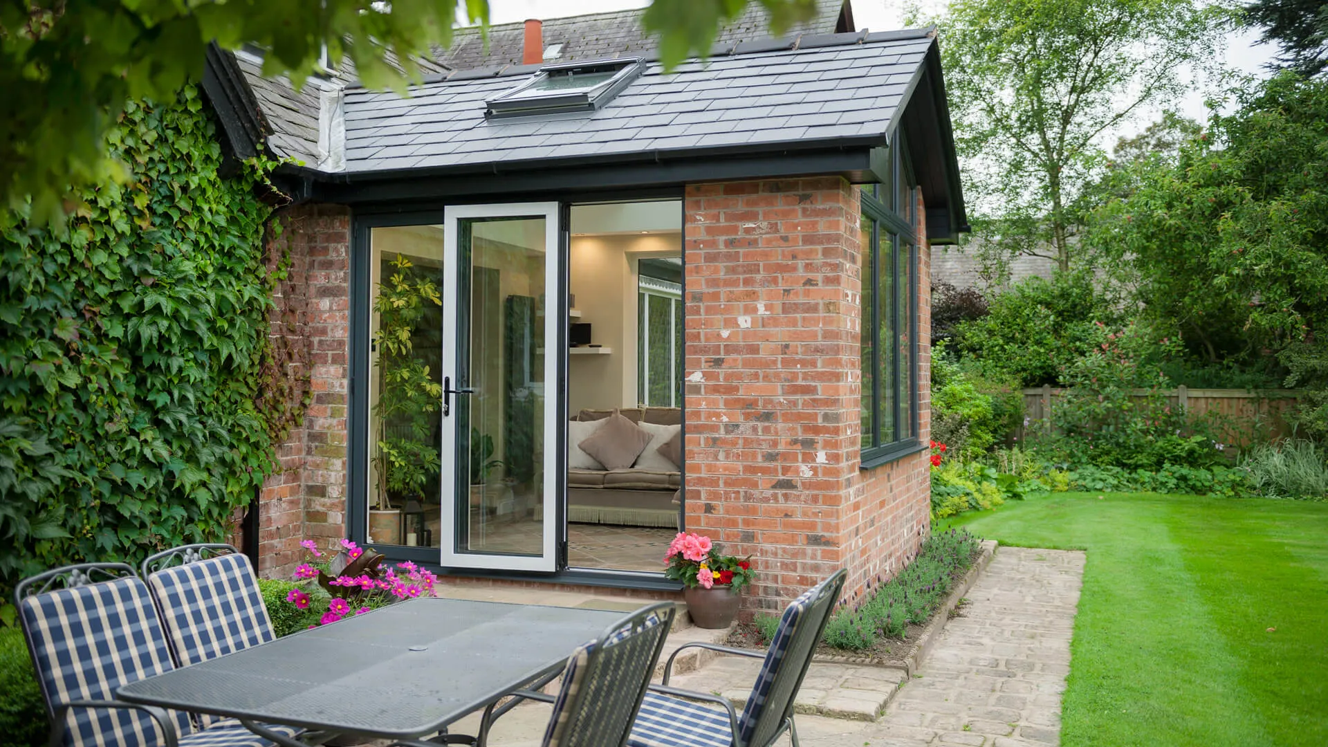 Go to the far end of the garden and the tiled roof extension really sticks out, for all the right reasons. As you get closer to it, the bi-folding doors become most apparent, which you can glide and fold away when you enter into the extension. The high-pitched roof makes it feel very spacious internally, with the roof windows also playing a role in that. The sun also gets in via the front-facing window.