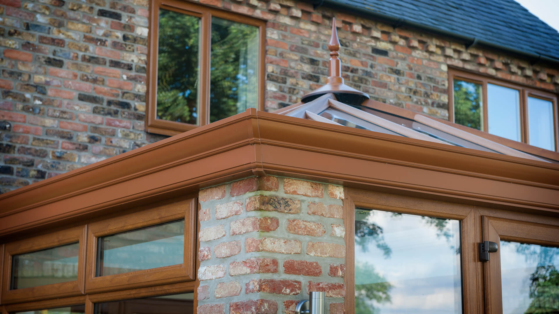 With such a beautiful garden area, the orangery included include French doors so that a quick escape can be made outside when the urge to do so is too great. They have luxurious side panels that help to drive natural light into the very heart of the extension. Directly opposite the French doors is their equal – another set of French doors for exiting the extension and heading back into the traditional living space. The presence of an internal pelmet was useful as it allowed us to fit spotlights, which get immediately switched on when the sun starts to go down at night. That same unmistakable Golden Oak colour has also been incorporated into the guttering, piping and decorative peak.